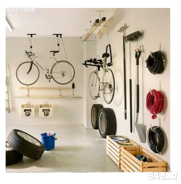 съхранявате велосипеда окачен на тавана в гаража или мазата. С помощта на задържащи куки, е възможно закачането на всички видове велосипеди с тегло до 20 кг. Те могат изключително лесно да се повдигнат до максимална височина от около 4 м. Това не само пести пространство, но и предпазва гумите, когато той не се използва дълго време. Стойката се монтира бързо и лесно, а държачите са изработени от прахово боядисана стомана, която е одобрена от TÜV и GS.