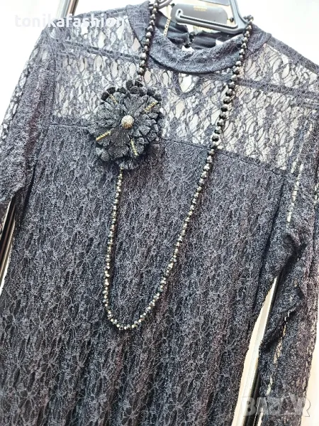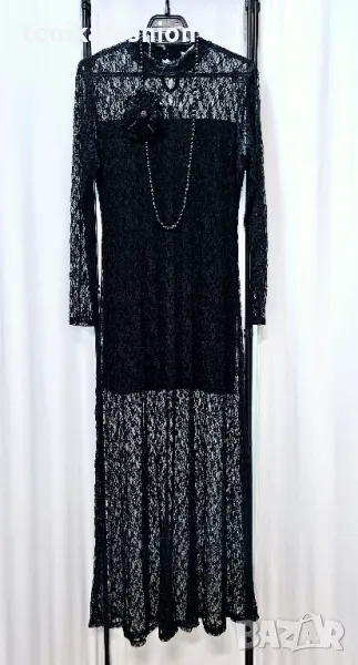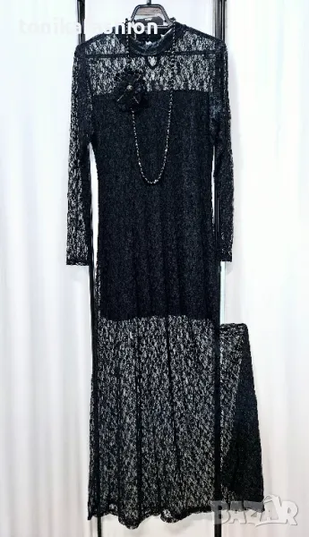 Дълга дантелена рокля с къса подплата. Втален модел с разкрояване по дължината. Полу поло с копче на врата. Един размер подходящ за S и М. Колието е отделно 22лв.