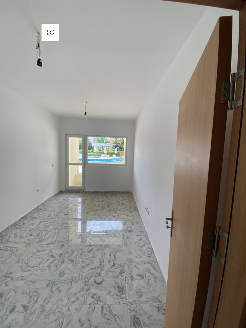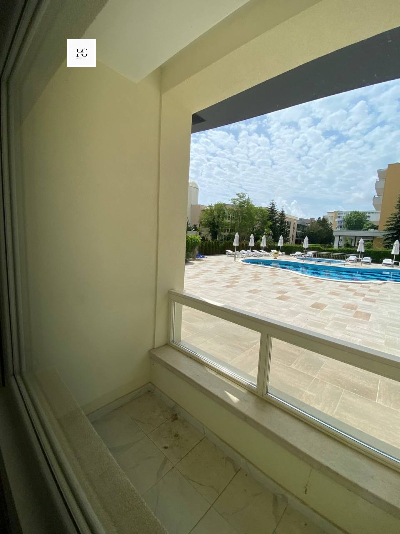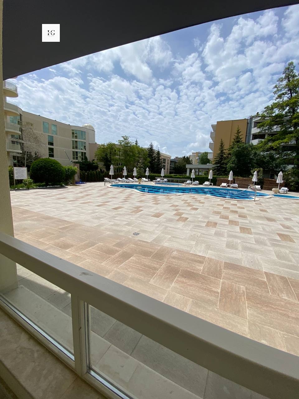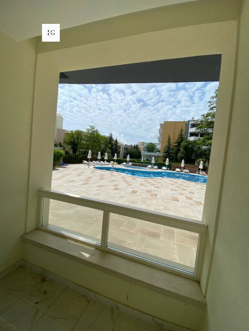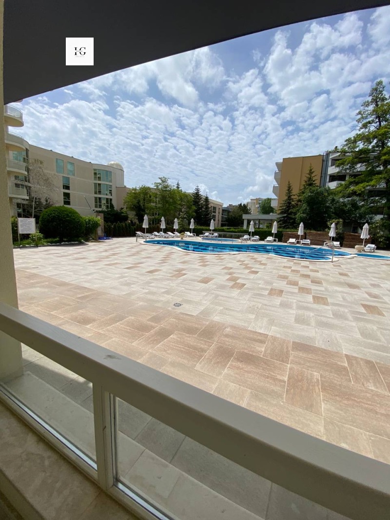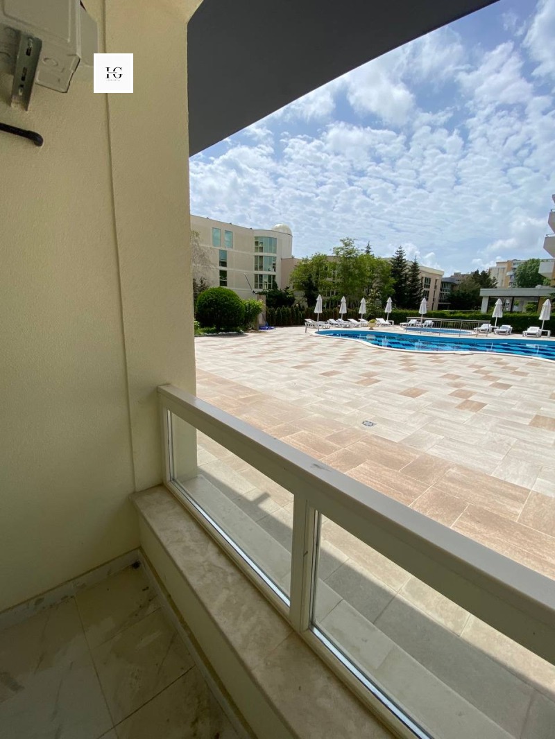 Апартаментът е с площ 59 кв.м и се намира на партерен етаж с директен изход към басейна. Разполага с просторна дневна с изводи за кухня, уютна спалня, баня с душ и тоалетна, както и две тераси с гледка към басейна.