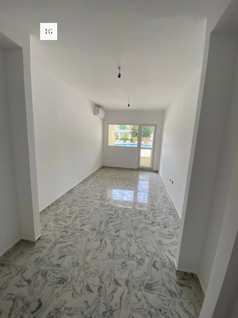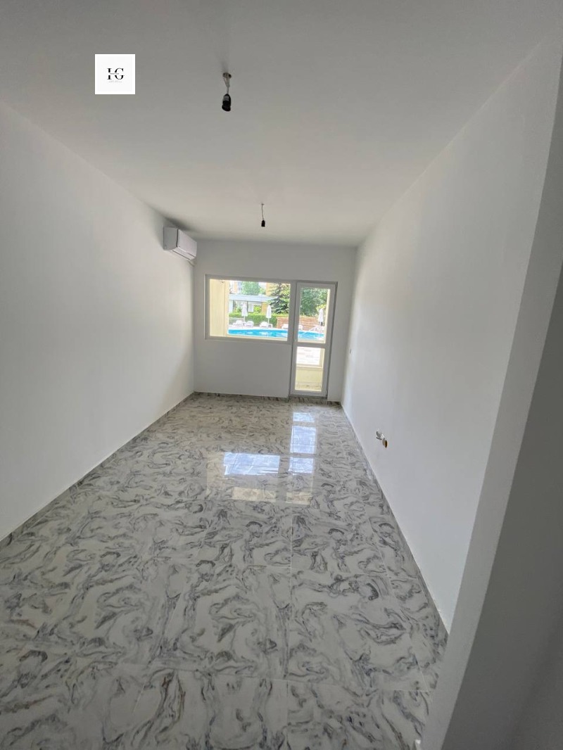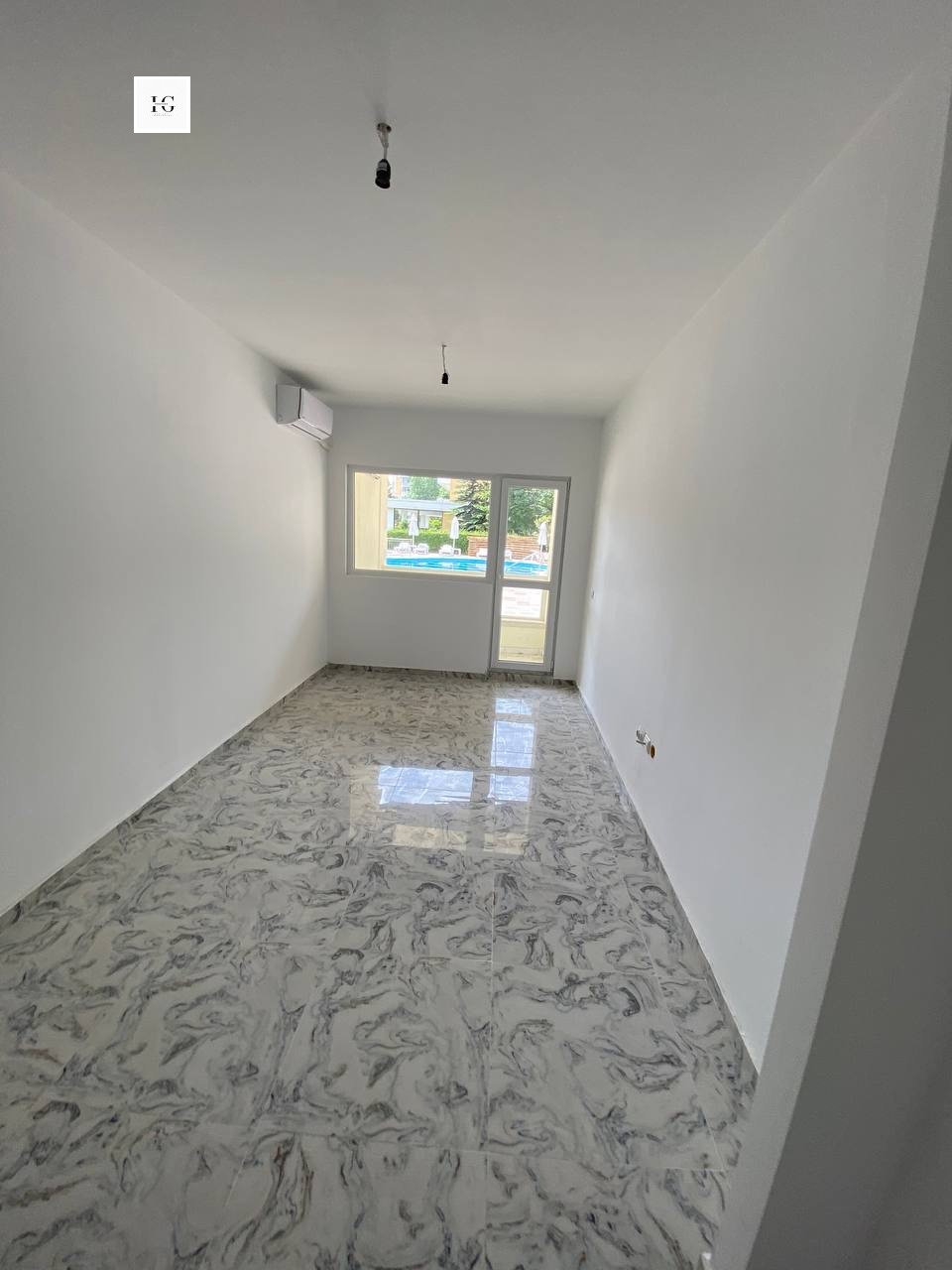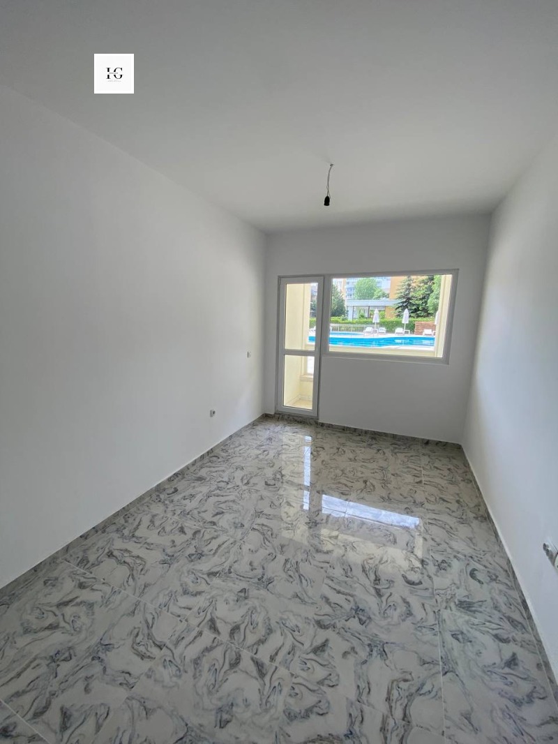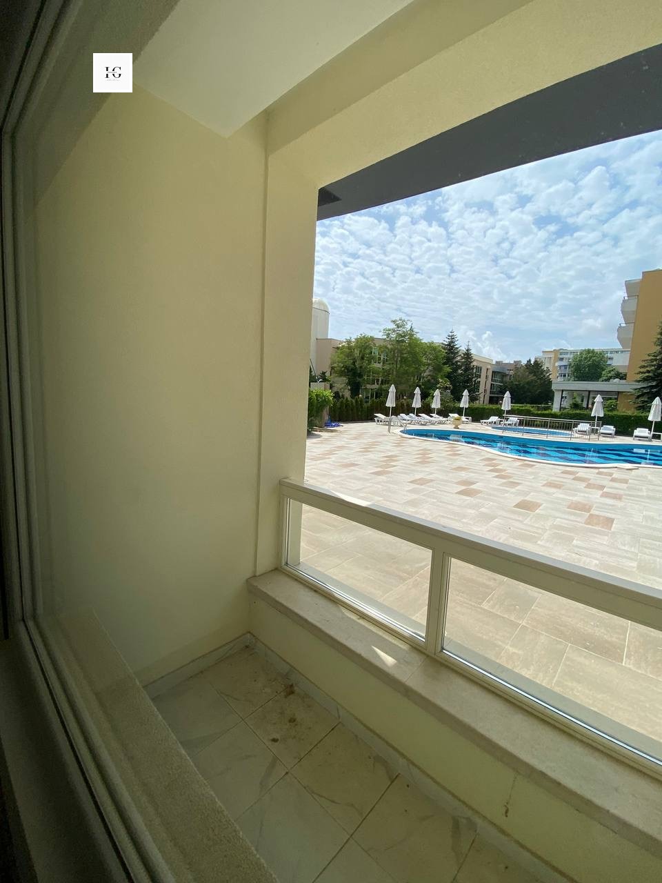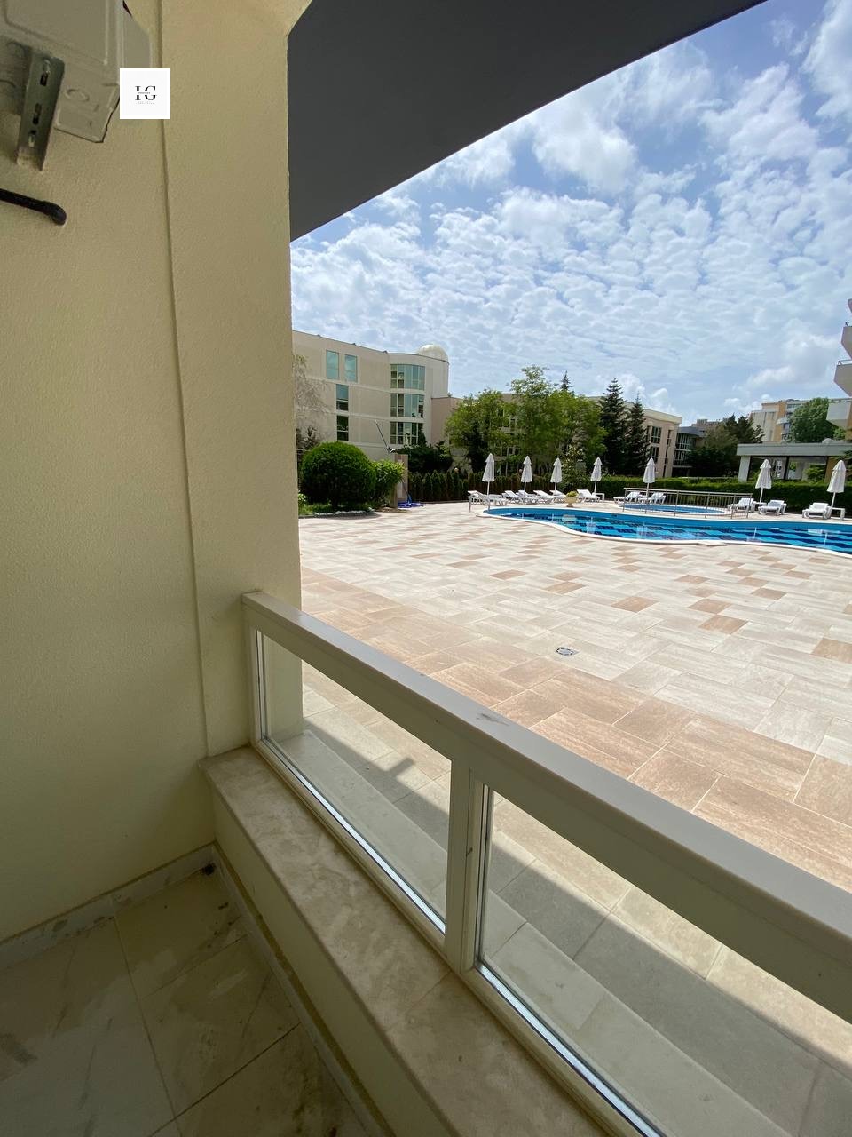 Апартаментът е с площ 59 кв.м и се намира на партерен етаж с директен изход към басейна. Разполага с просторна дневна с изводи за кухня, уютна спалня, баня с душ и тоалетна, както и две тераси с гледка към басейна.