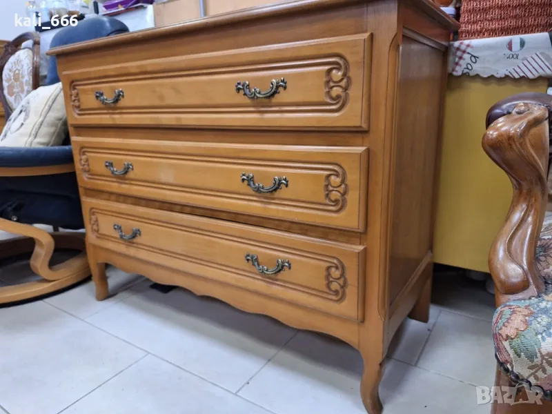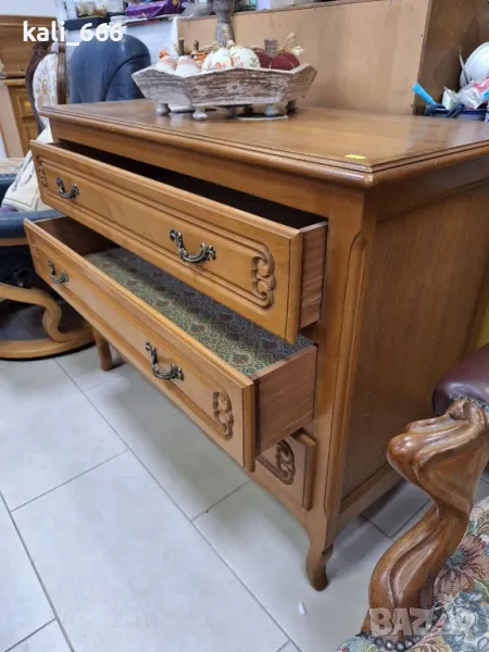 Красив практичен скрин в ретро стил, декорирани с резбовани елементи и стилен обков. Максимални размери: 101/46/80 см височина. В добро състояние с нормални следи от употреба. Закупен от Холандия.