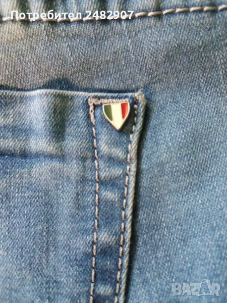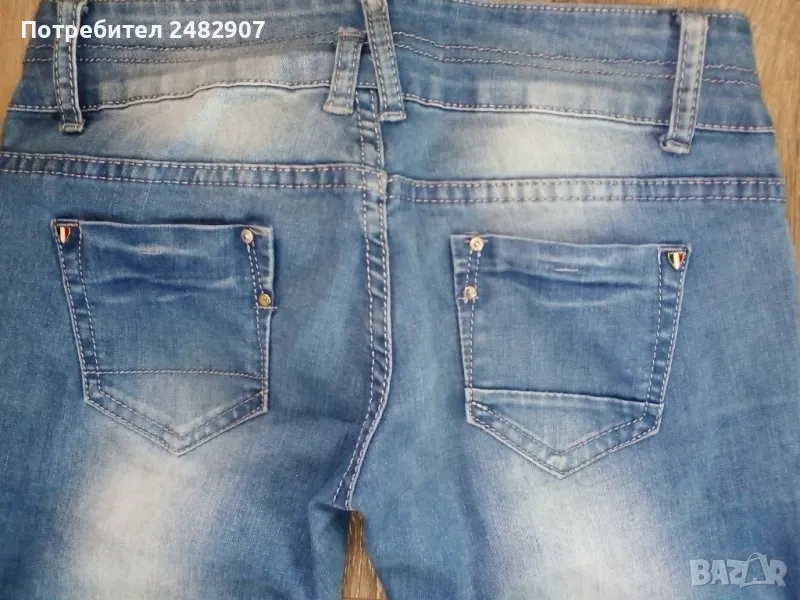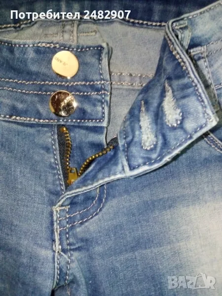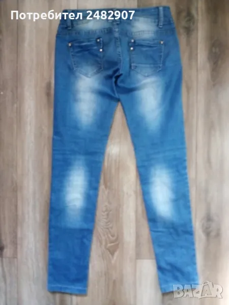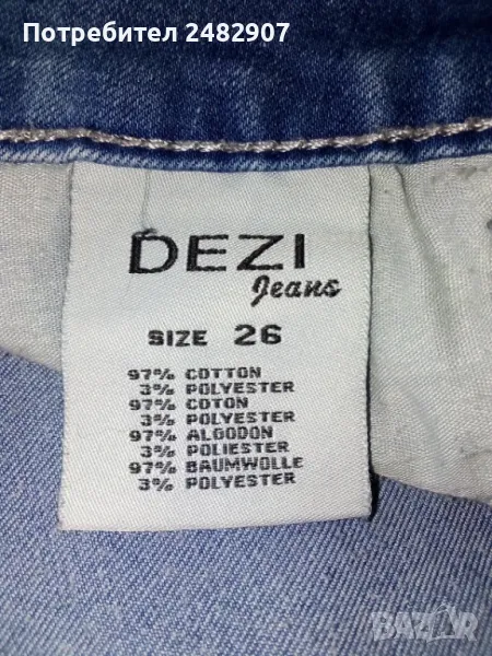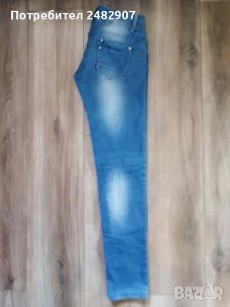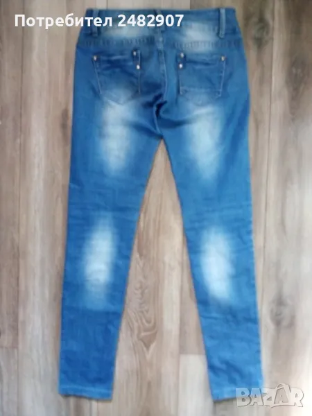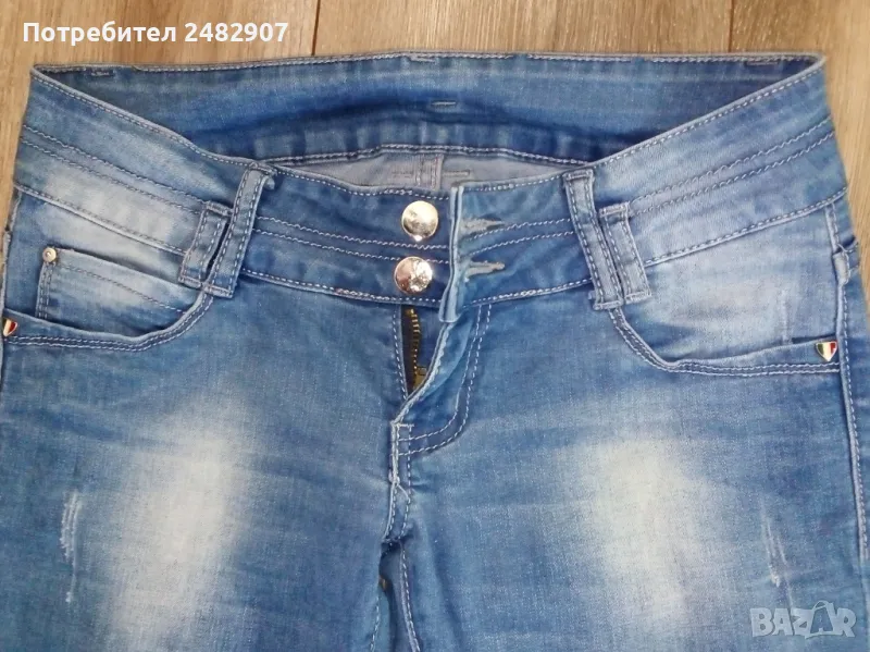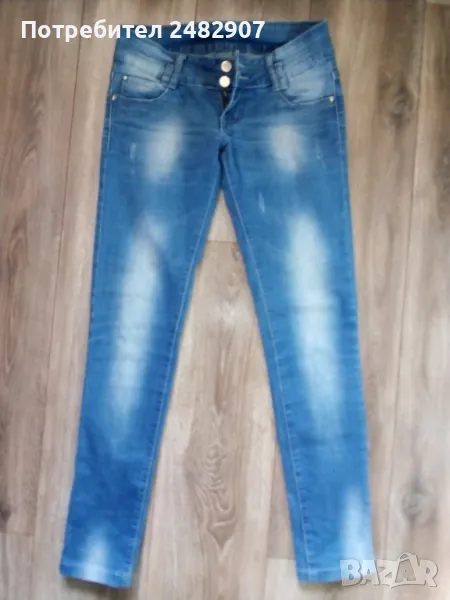 Сини дамски дънки с ниска талия, размер 26. Съдържат 97 % памук и 3 % полиестер. Ширина в талията - 37 см, дължина от талията до чатала - 16 см, дължина от талията до долу - 90 см, ширина на крачола в долната част - 13 см. Много запазени, почти не са използвани, закопчаване - с малък цип и две копчета отпред, два задни джоба, предните джобове са зашити, леко еластични.