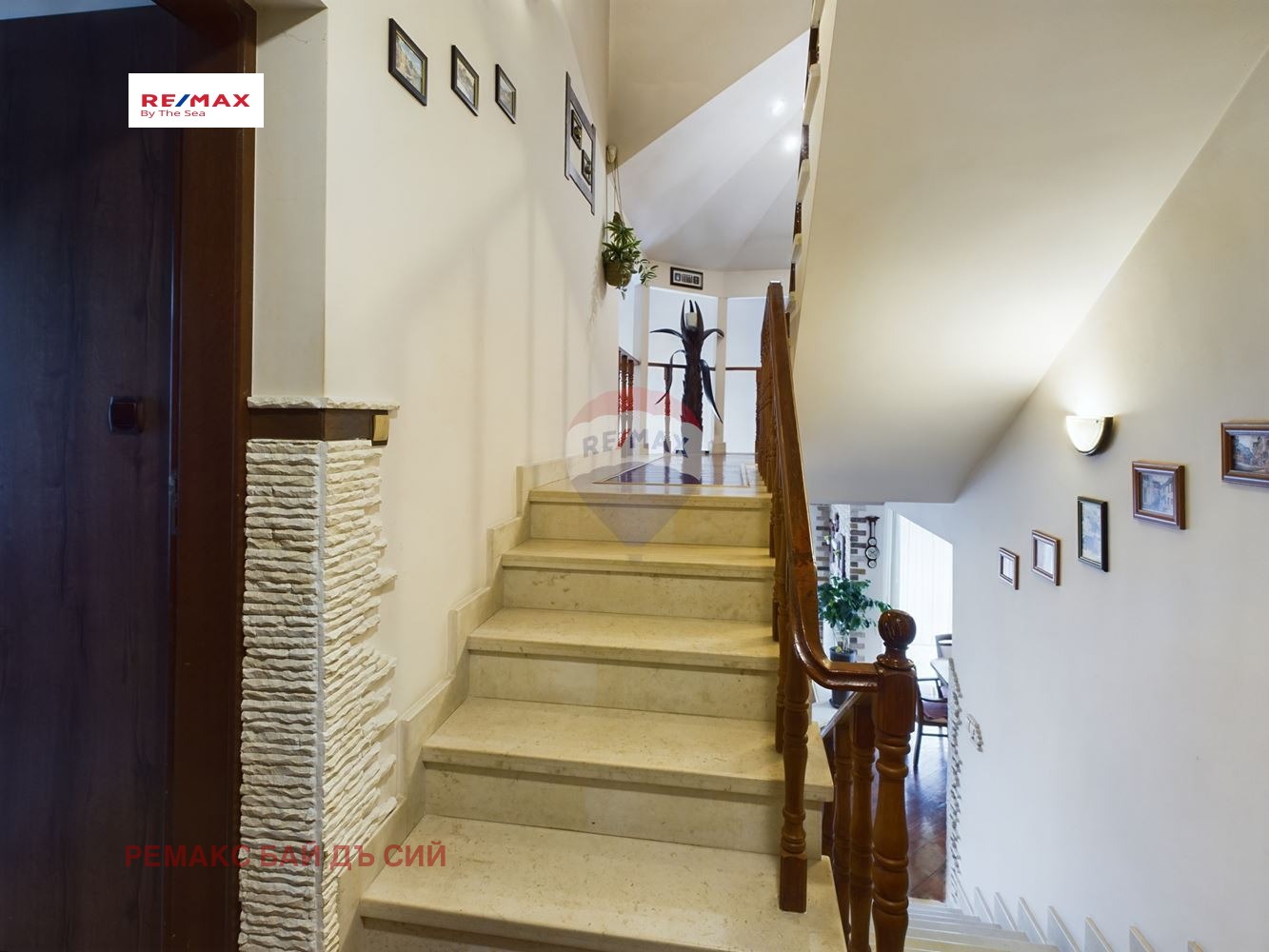 - Първото ниво се състои от светъл хол тип емпоре с големи френски прозорци, които осигуряват много естествена светлина и излаз на веранда, кухня с трапезария, тоалет, перално/килер, помещение, което е подготвено да се направи на сауна, стълбище.