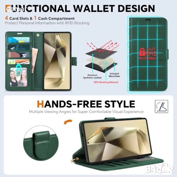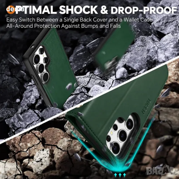 Проектиран за Galaxy S25 Ultra (6.9", 2025), този 2-в-1 свалящ се калъф от PU кожа съчетава стил и функционалност. Изработен от първокласна PU кожа с удароустойчива TPU рамка, той разполага с магнитно закопчаване, подвижна каишка за китка и защита на цялото тяло. Поддържа безжично зареждане, когато задният капак е свален и е съвместим с батерии, магнитни портфейли, и дизайнът на портфейла включва четири слота за блокиране на RFID, единият с плъзгач за бърз достъп осигурява лесен достъп до всички портове и бутони, докато сгъваемата стойка позволява гледане без ръце.