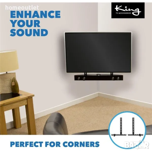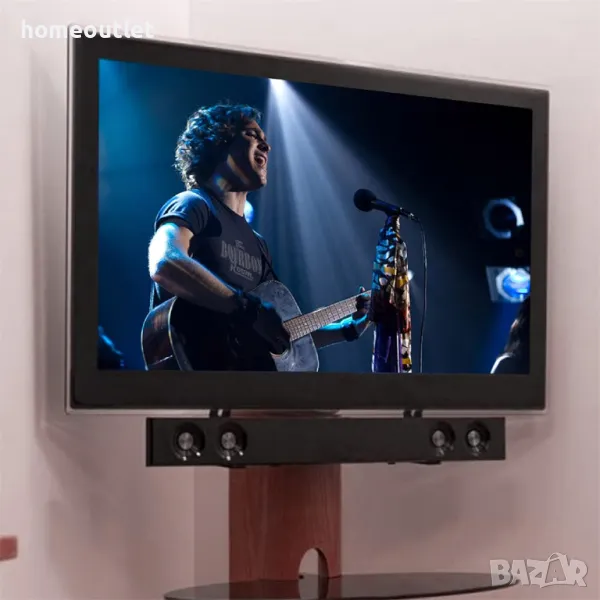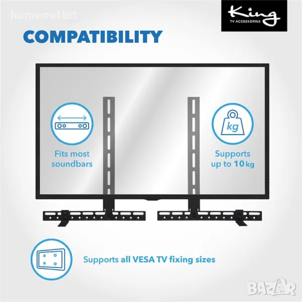 Универсалната монтажна скоба за звукова лента може да съхранява звукова лента с тегло до 22lbs/10 кг и е съвместима с всички размери VESA.