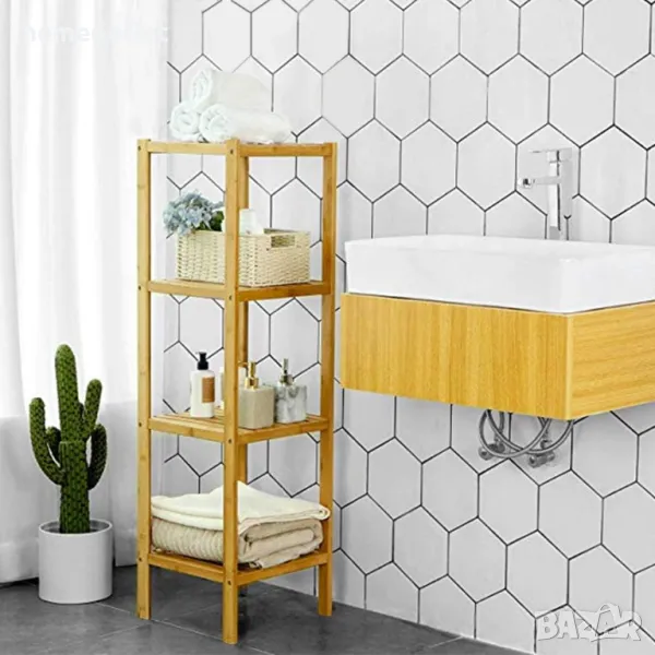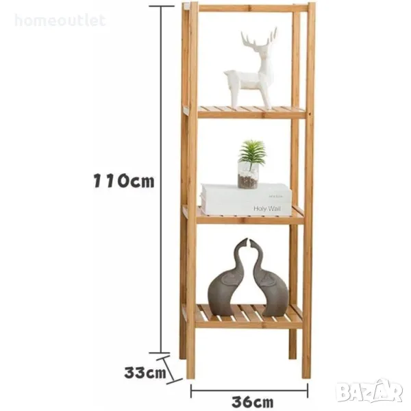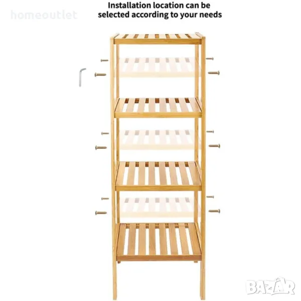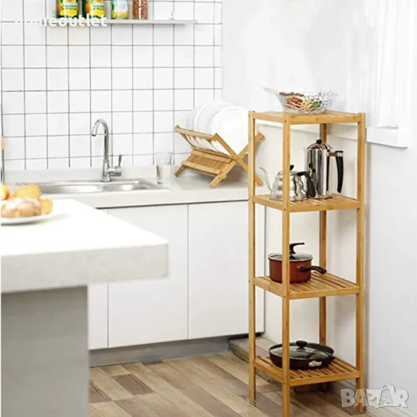 Бамбуковият стелаж с размери 36 см X 33 см X 110 см. се побира във всеки подходящ ъгъл в дома ви и има 4 нива за организиране и подреждане на различни вещи, без да заема много място.