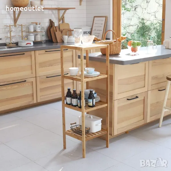 4-степенният стелаж е изработен от естествен бамбук, който е устойчив на влага и атмосферни влияния.