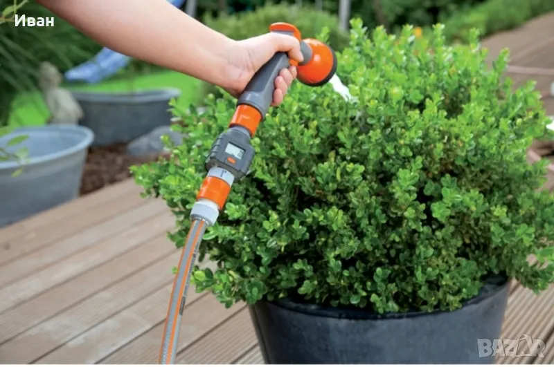 Може да се свърже както към чешма така и преди пистолета за напояване.