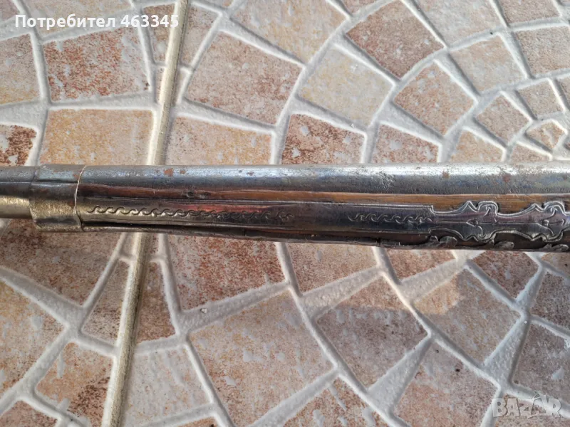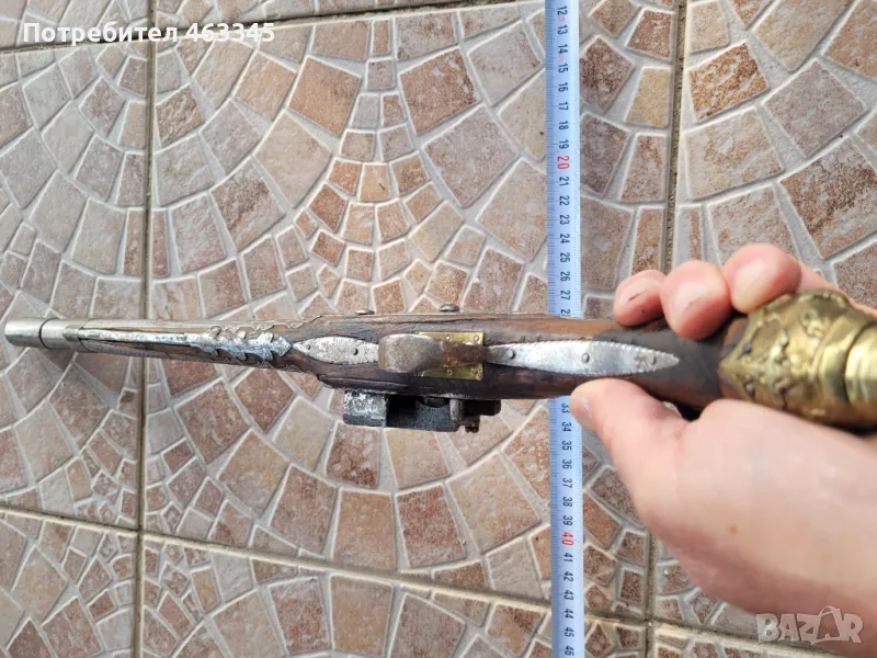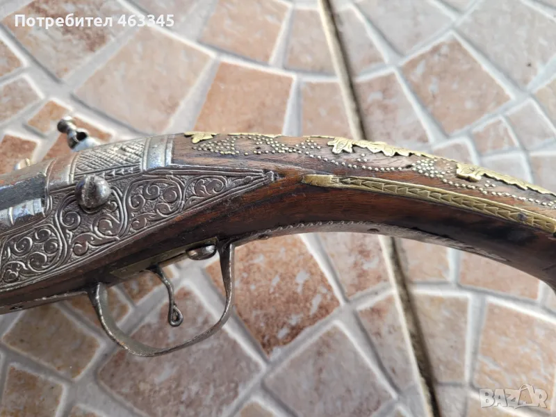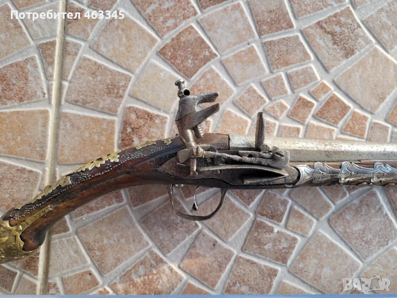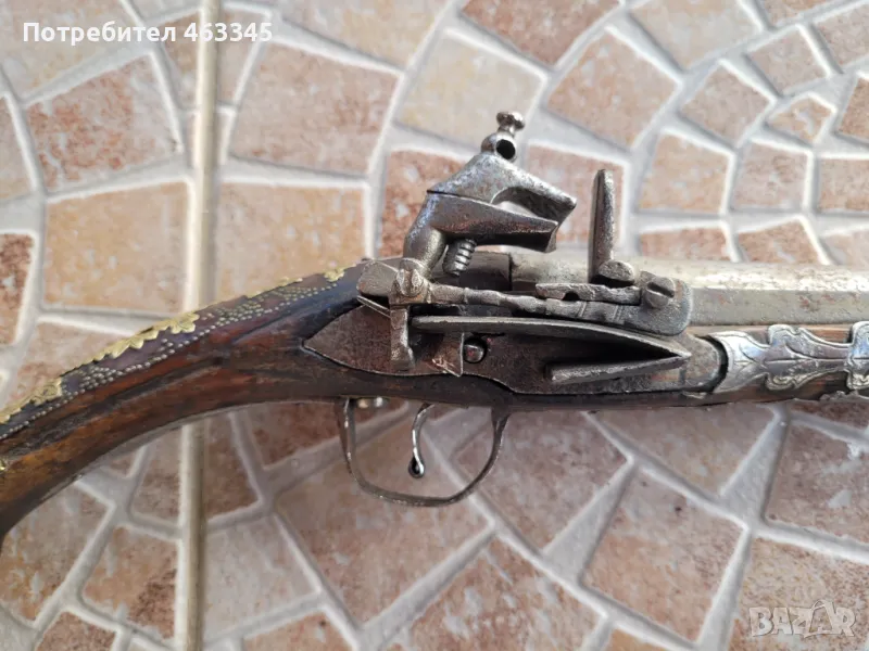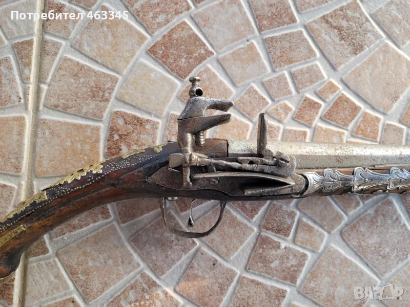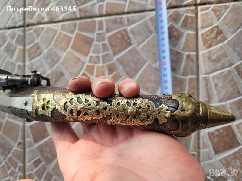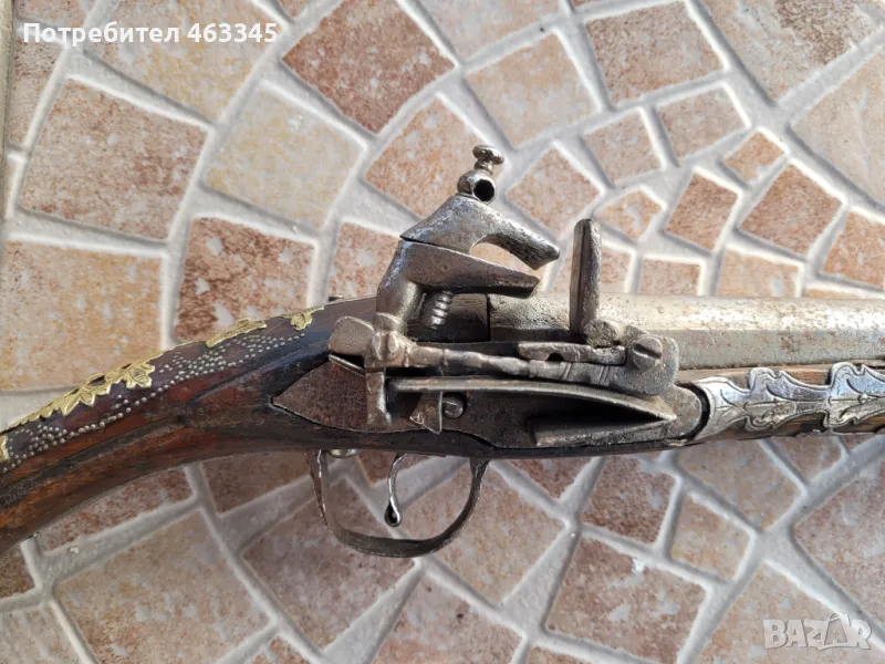Много голям, над половин-метров арнаутски пистолет. Изключителна изработка и прекрасно състояние. Дървенията е здрава, без дървояд и отчупено. Задната част на пистолета е бронзова, а предната и лявата са железни. По желязото практически няма ръжда. Тръбичката на шомпола е посплескана. Украсена цев. Невероятен обков. Микелетният механизъм работи перфектно - запъва и в двете положения и спуска надеждно. Силна бойна пружина, която вади искра от всеки път.