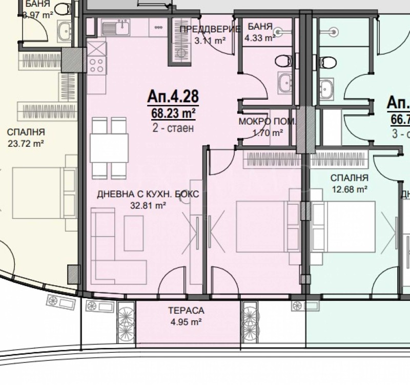 Апартаментът е ситуиран на 4-ти етаж от общо 15 и предлага обща площ 89.83 кв.м. (нетна площ 68.23 кв.м + общи части 16.82 кв.м), с мазе от 4.78 кв.м.