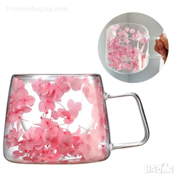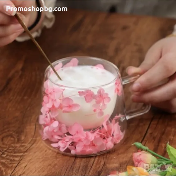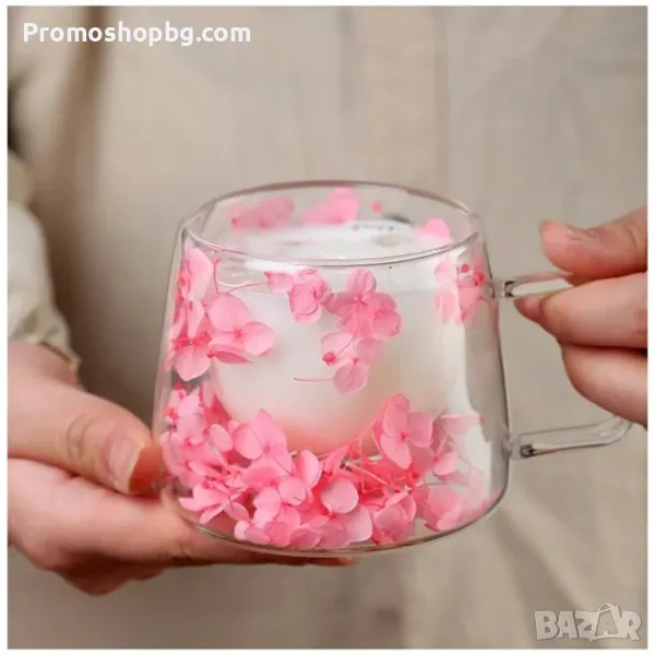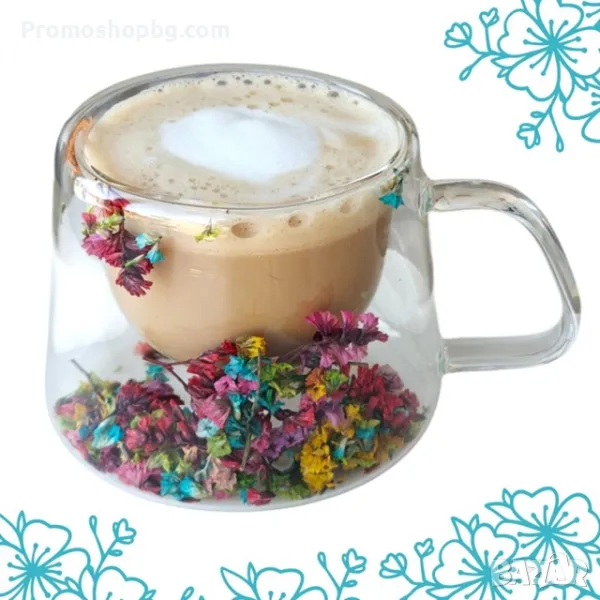 ПРОМОЦИЯ! Двустенна Стъклена чаша със сухи цветя, боросиликатно стъкло, 180 мл