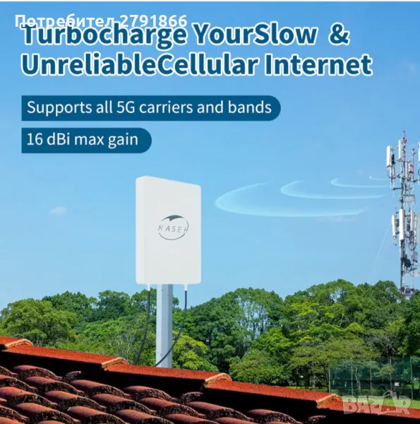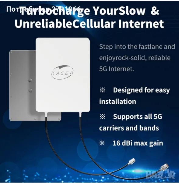 KASER 5G LTE външна антена Mimo Директива 3300 – 3800 MHz N78 Усилване до 15 dBi Съвместим с 5 g рутер N-SMA изход с TS9 адаптер Включва 10 метра кабел с ниски загуби