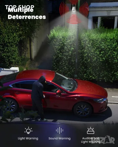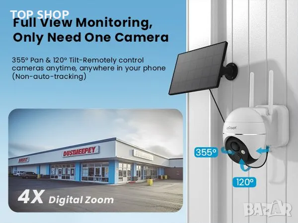 355°хоризонтално завъртане и 120°вертикално завъртане и 4X цифрово увеличение се контролират от приложението, със 130-градусов широкоъгълен, домашните охранителни камери гарантират панорамна снимка на всеки ъгъл на вашия дом, магазин, гараж. Можете също така да провеждате разговори в реално време чрез вградения микрофон и високоговорител. Тази безжична външна охранителна камера ще бъде чудесен инструмент за изплашване на натрапници.