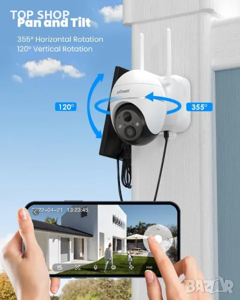 ieGeek 2K безжична WiFi 360°PTZ охранителна камера за наблюдение захранвана със слънчева батерия