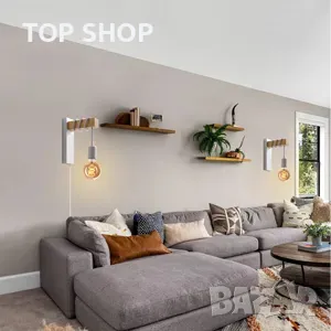 - Дървена стенна лампа с щепсел, количество: 2 бр, цвят: бял, материал: метал/дърво.
