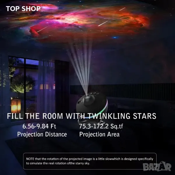 Поддържа настройка на разстоянието за прожектиране от 6,56 до 16,4 фута и площта на прожектиране от 269 кв. фута може напълно да покрие тавана или стената на стаята. Можете да създадете прекрасна галактика в стаята за романтично време или семейно време, високопрецизният обектив ви предоставя реалистично звездно небе, което можете да изпитате галактики и мъглявини у дома.