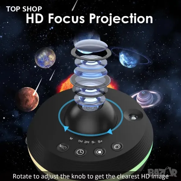 Този галактичен проектор за спалня поддържа завъртане на 180°, за да покрие тавана, стените или пода. И можете да регулирате фокуса чрез завъртане на обектива, за да получите по-ясна, цветна сцена на звездното небе. Пет групи лещи с висока пропускливост, 6500K богат източник на светлина, правят звезди разпръснати из стаята, внасят вълшебно светлинно шоу на галактика на закрито. Проекторът за нощно небе ще създаде страхотна атмосфера за сватби, рождени дни, партита, годишнини и др.