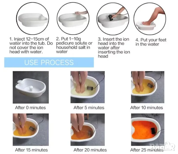 Процесът на йонният детоксикатор за ваничка, е удивителен метод за цялостно пречистване на организма, посредством използването на положителни и отрицателни йони, излъчени от йонен генератор, познат е още и като електролиза. Електродният елемент е този, който излъчва йони във ваничката с вода, в която сте поставили краката си. Той се включва към главното устройство, от което можете да контролирате и променяте интензитета на терапията.