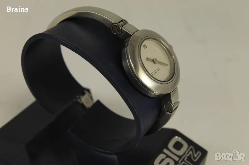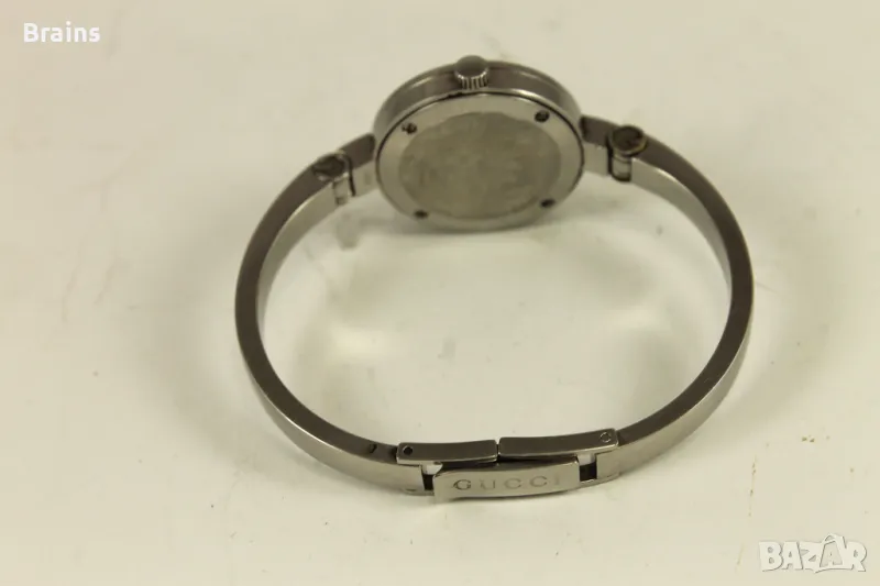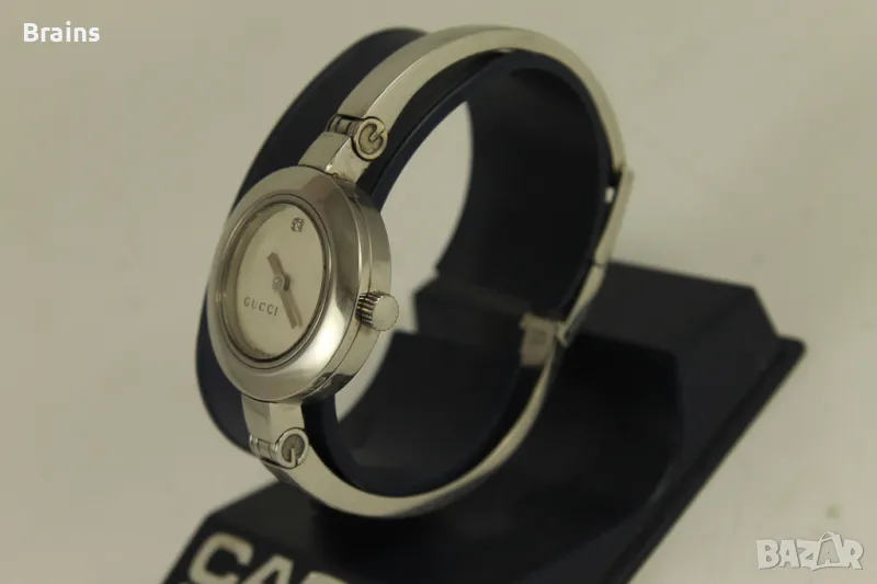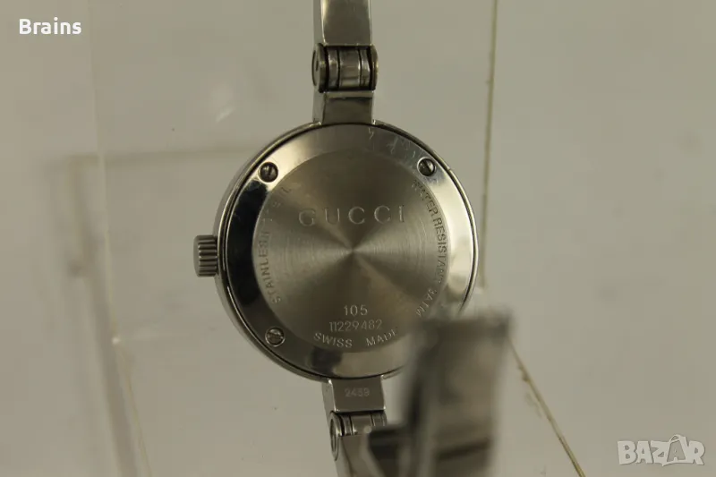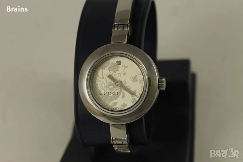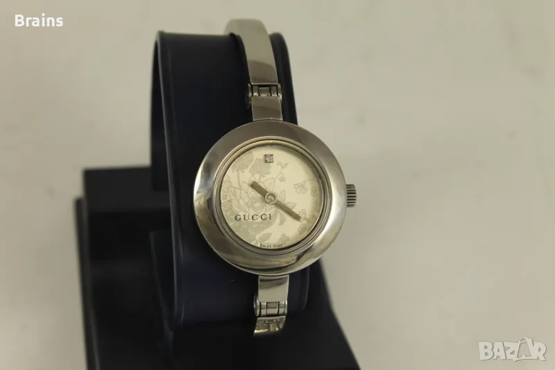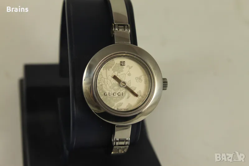 Оригинален дамски Швейцарски часовник GUCCI 105. Изцяло изработен от неръждаема стомана. Швейцарски кварцов механизъм. Циферблат с цветя и диамантче. Часовника работи точно. Много добро визуално състояние.