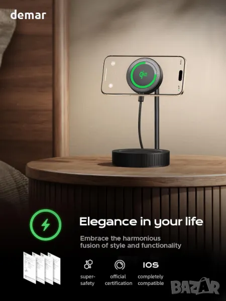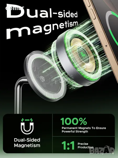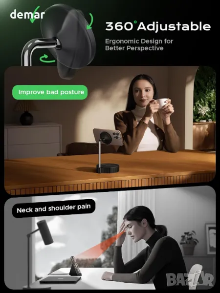Сертифицираното безжично зарядно устройство Qi2.0 осигурява бързо и ефективно зареждане, удвоявайки мощността на iPhone от 7,5 W на 15 W, достигайки 50% само за 30 минути. Регулируемата на 360° магнитна стойка предлага ергономичен дизайн за персонализирани ъгли, повишавайки комфорта и производителността. Изработен от военни алуминиеви сплави, той осигурява издръжливост и стабилност, с утежнена основа и опционално лепило за допълнителна сигурност. Щадящото кожата, текстурирано покритие осигурява първокласно усещане, докато силното магнитно захващане от 1600 g поддържа устройствата сигурни. Включва скоба за зарядно за Apple Watch (не е включено), което го прави практично решение за съхранение "всичко в едно".