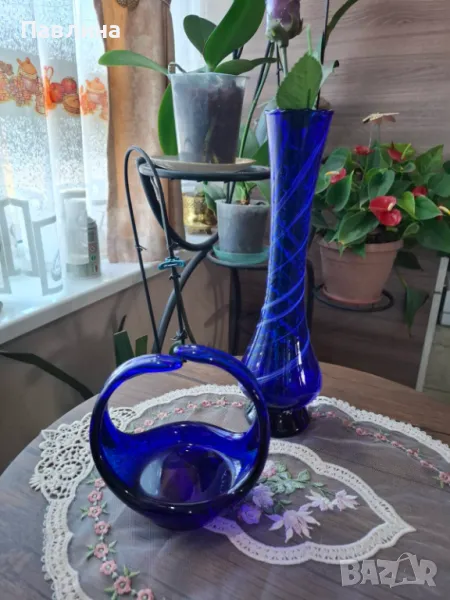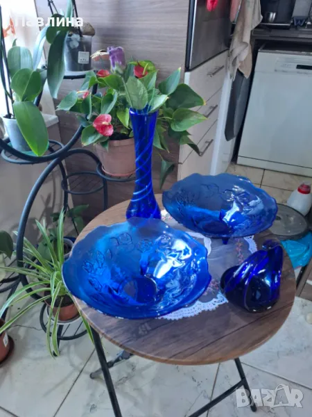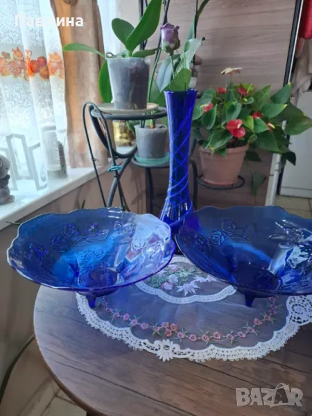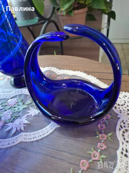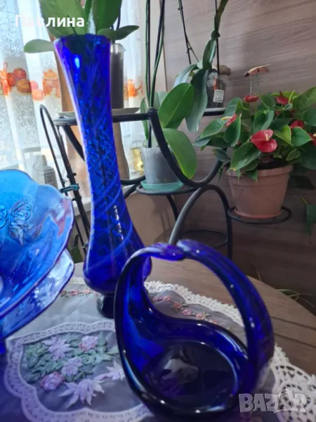 Две фруктиери от синьо стъкло. Цена за брой 15 лв. Кошничка цена 20 лева. Ваза цена 20 лв. При интерес изпращам допълнителни снимки и размери.
