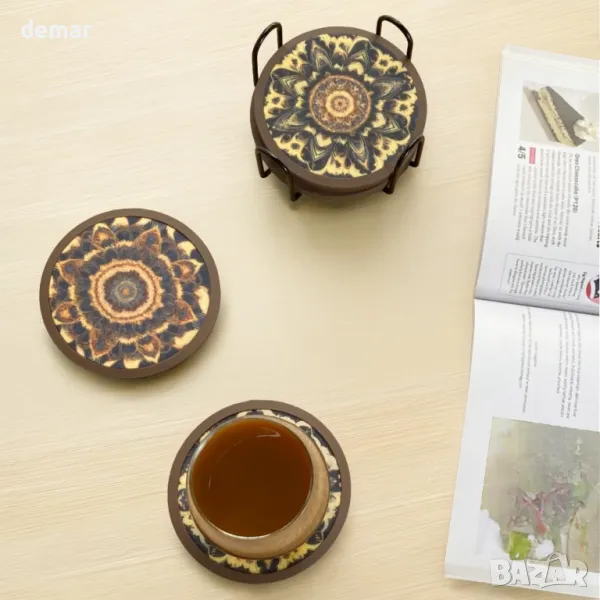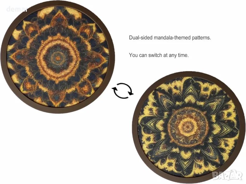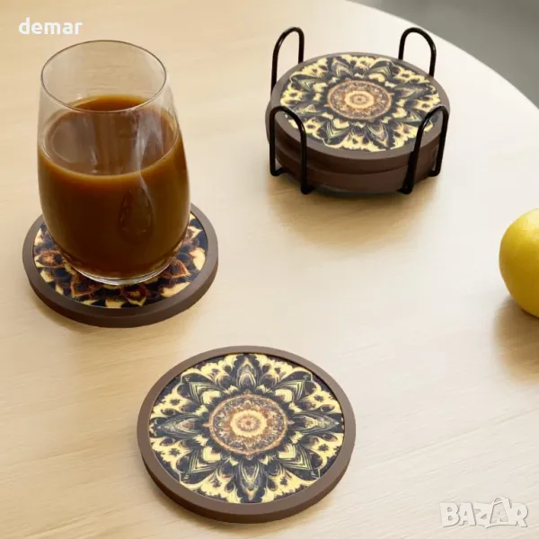 Комплектът включва шест кръгли нехлъзгащи се силиконови подложки (кафяви, 11 см), шест двустранни абсорбиращи филцови вложки с модел на мандала и 11,4 см черен метален държач за подредено съхранение. Вложките абсорбират влагата от изпотяващи се напитки, предотвратявайки накапване върху повърхности или дрехи и няма да залепнат за чашите. Висококачественият силикон осигурява стабилност без надраскване на повърхностите. Както подложките, така и вложките могат да се мият в съдомиялна машина, но също така могат да се мият на ръка и да се сушат на въздух.