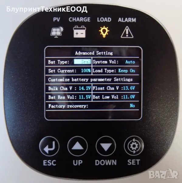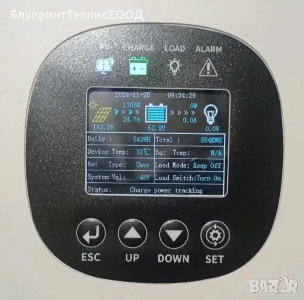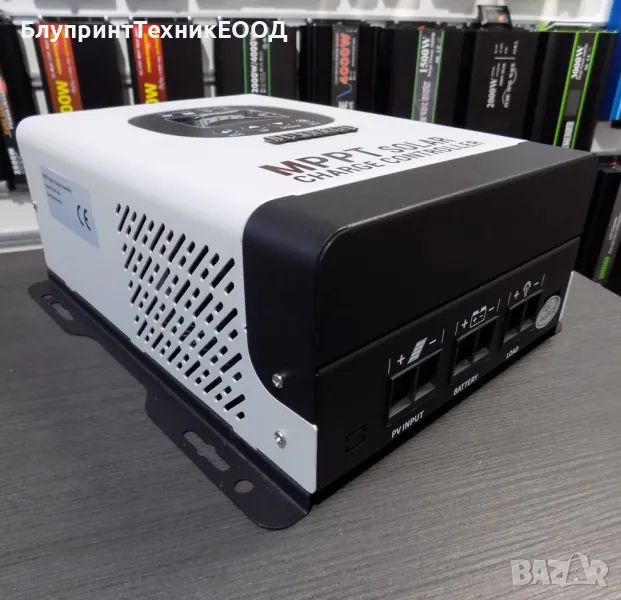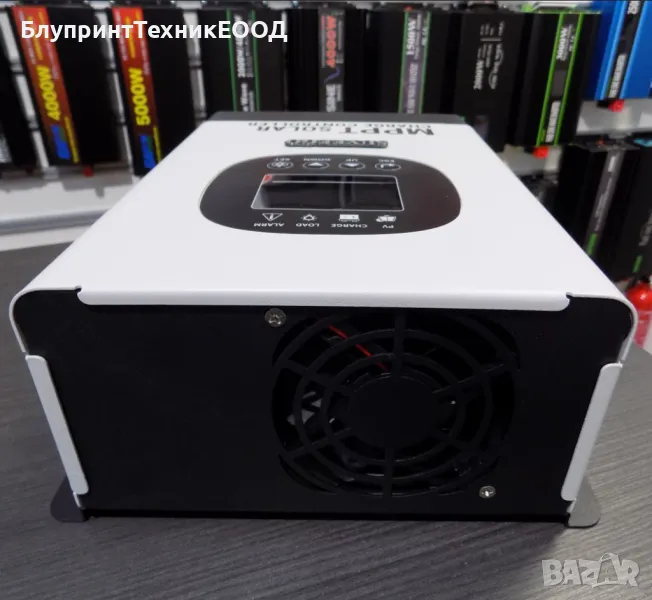 Контролерът поддържа максимално входно напрежение от фотоволтаиците до 230V OC и ток до 60А. Предлагаме модификации на този модел със вход до 230V и 480V OC, със или без Wi-Fi за отдалечено наблюдение и контрол, с номинален заряден ток 60А и 120А.