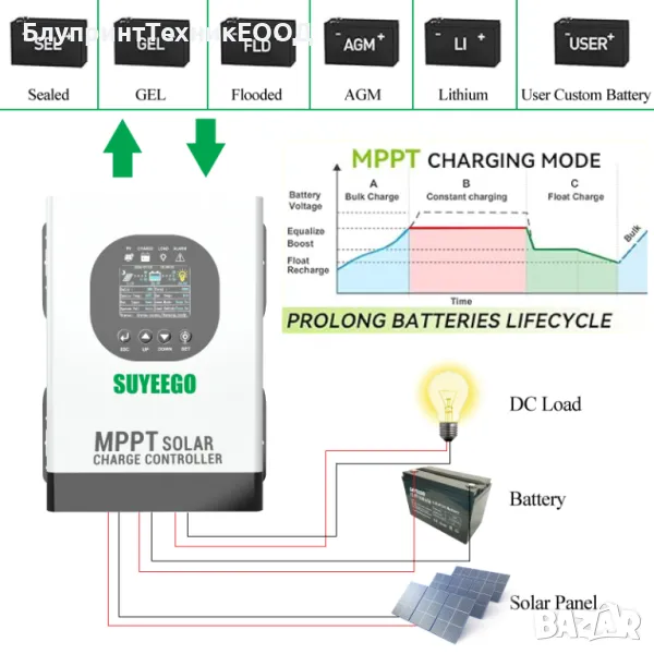 Поддържа разнообразие от типове акумулатори, както и потребителски избор на стойностите. Разполага с функция за ограничаване на зарядния ток към батерията до желана от потребителя стойност, като тя се задава на стъпки от 1% до 100% от номиналните 60А, осигурявайки прецизно подбиране на оптимален заряд в зависимост от капацитета на акумулатора. Благодарение на тази функция може да бъде свързан соларен масив с голяма мощност и да се използва само част от нея, което осигурява стабилно зареждане с еднакъв ток през целия ден, дори при облачно време с променливо или слабо слънцегреене, без риск от повреда на батерията.