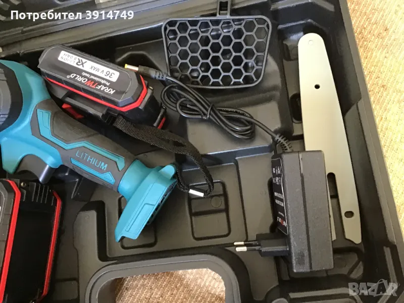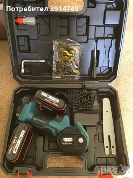 Чисто нов комплект + добавена втора батерия. Включено е всичко: верига, държател за веригата, зарядно, предпазител, масло за смазване на веригата, отвертка, ключ.