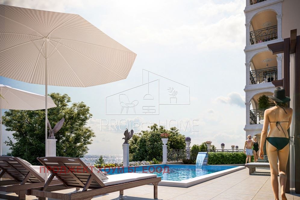 PRОject HOME/ Проджект хоум Ви представя двустаен апартамент в луксозен затворен комплекс на първа линия в гр. Несебър. Апартамента се състои от антре, просторна трапезария с кухненска част, спалня, баня с тоалетна, балкон и мазе.