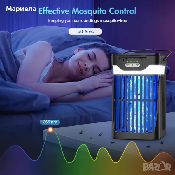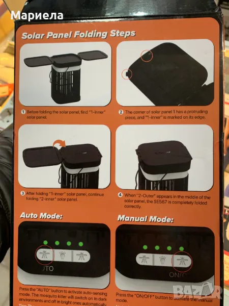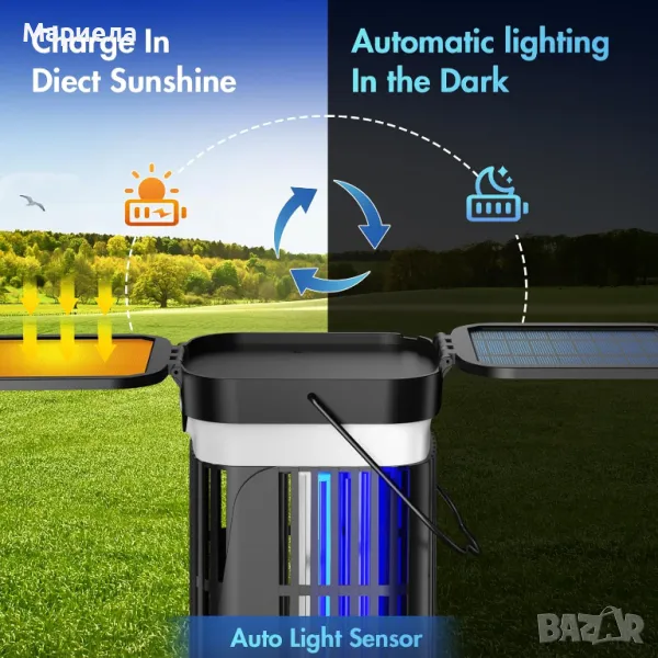 Оборудвана с вграден сензор ден-нощ. Ако не искате да го включвате и изключвате често, просто натиснете автоматичния бутон. Автоматично се активира в режим против комари през нощта и се изключва призори (тази функция изисква слънчевият панел да е включен). Можете също да изберете ръчен режим; винаги работи, независимо дали се зарежда от слънчева енергия или USB.
