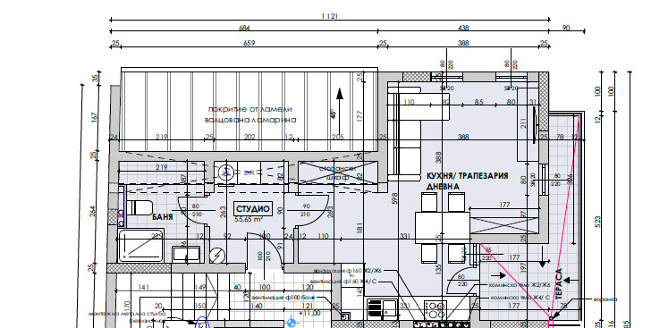 Едностаен апартамент със североизточно изложение на пети жилищен етаж. Разпределен е на едно голямо помещение, килер, баня с тоалетна, тераса.