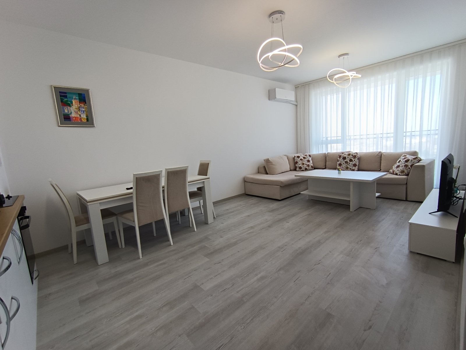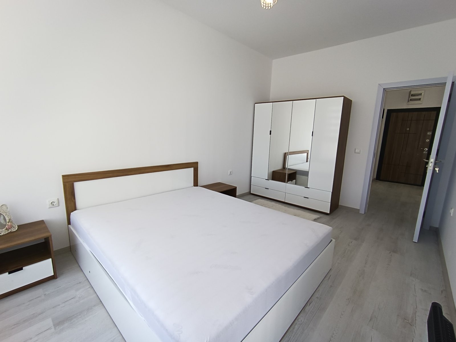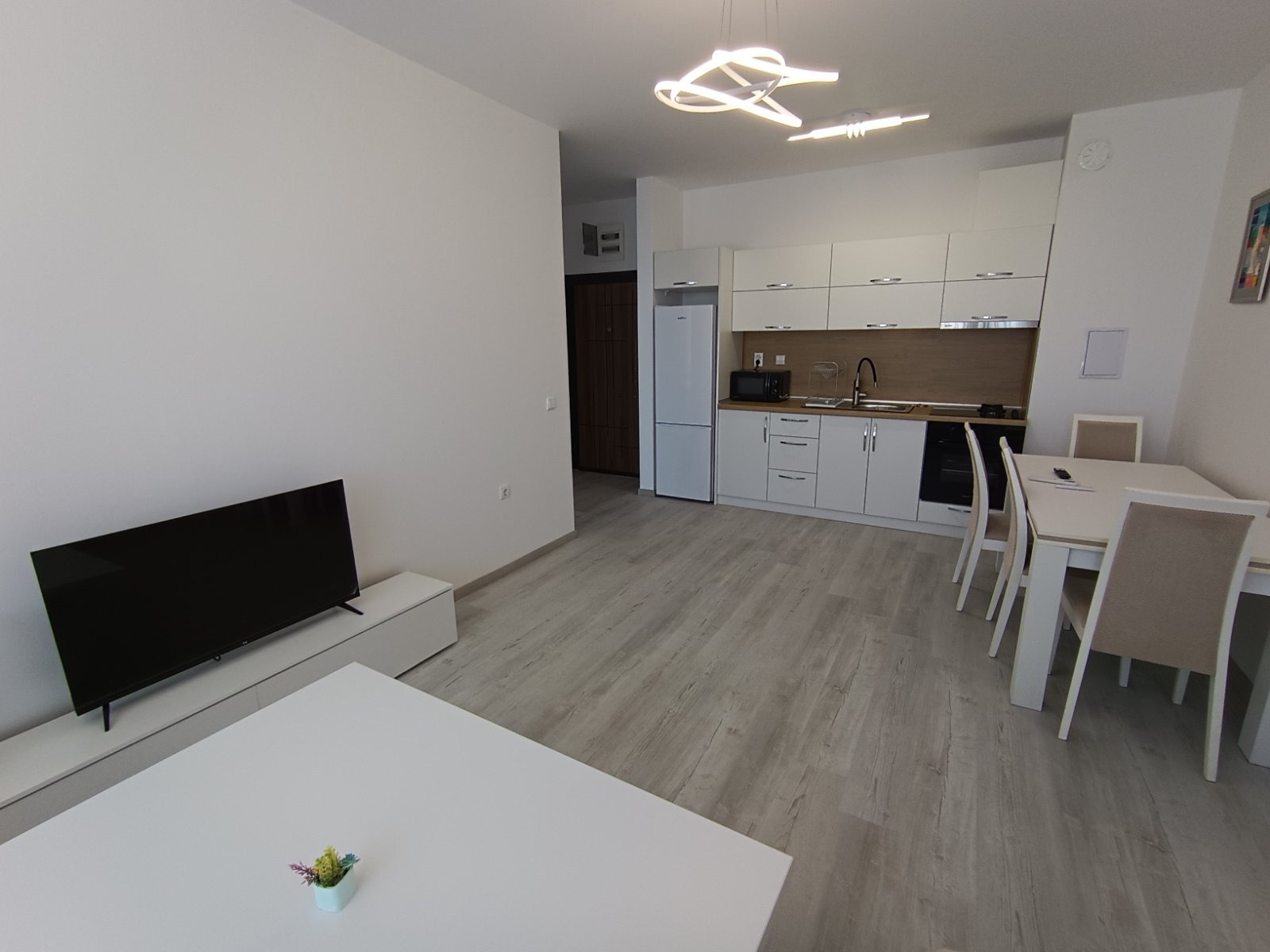 Състои се от входно антре, хол с кухня, спалня, баня с тоалетна, мокро помещение и тераса. Обзаведен е с качествени мебели и електроуреди. Отоплява се с климатици! С западно изложение.