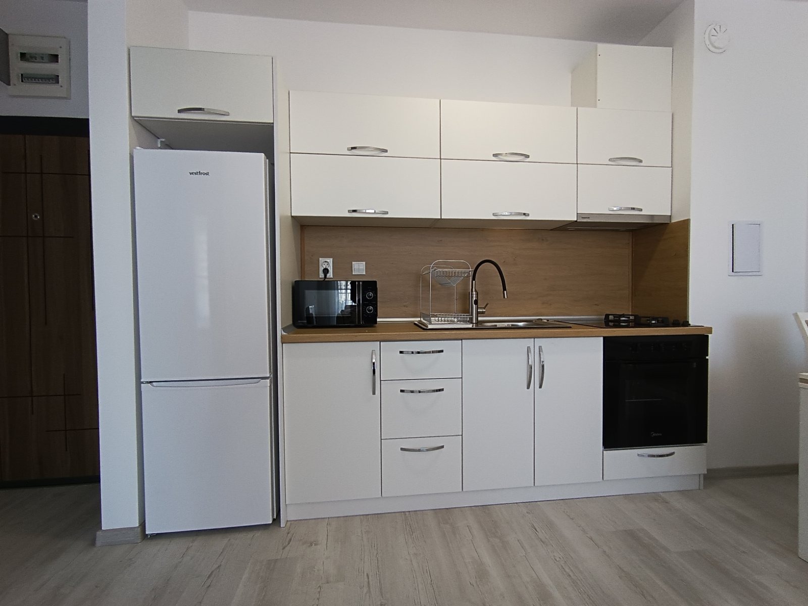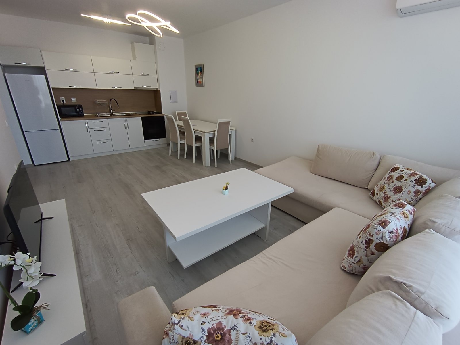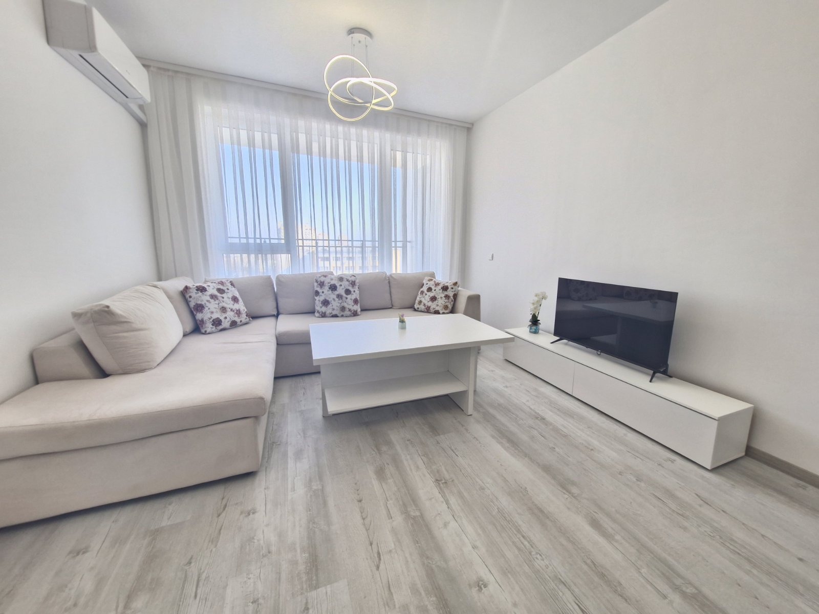 Състои се от входно антре, хол с кухня, спалня, баня с тоалетна, мокро помещение и тераса. Обзаведен е с качествени мебели и електроуреди. Отоплява се с климатици! С западно изложение.
