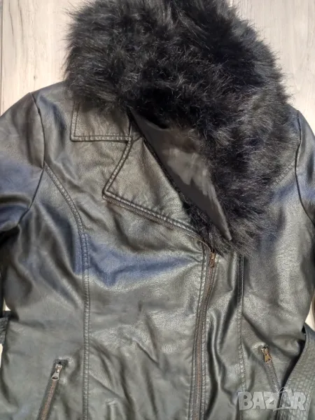 Красиво и ефектно, кожено яке с пухена яка, която се маха. Отвътре е с пухена подплата. Не е обличано.