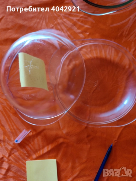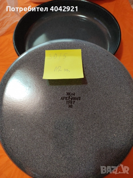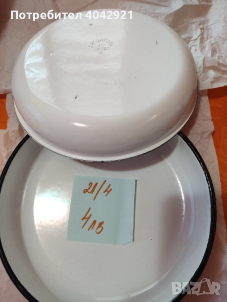 4лв два брой бяла.Размер 21 см. има забележки по ръбовете.Тъмно синя има забележка на ръба. Размер 30 см.Цена 12лв.Тави от соца.Фабрика Брацигово.Мога и да ви снимам всичко по отделно ,ако нещо ви хареса.Едно използвано плаке светло синьо.Размер и цена написано на жълтия лист.Йенските съдове са използвани. Тенджерите да 3 броя .Имат забележки.