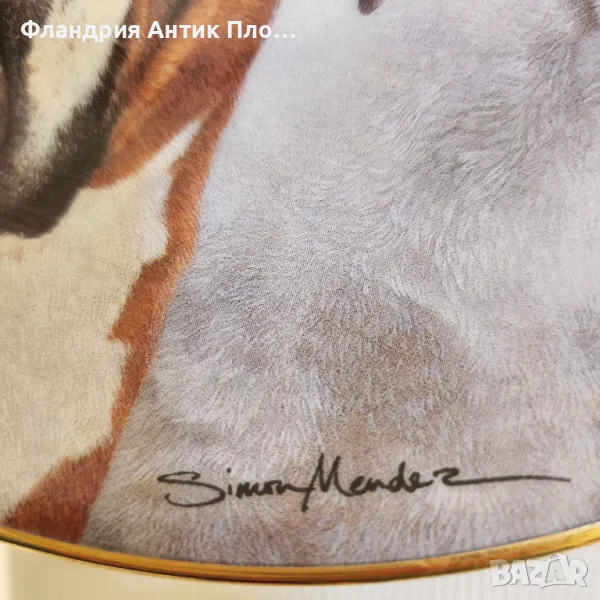 Изящна лимитирана колекционерска чиния от Danbury Mint, посветена на емблематичната порода боксер. Дизайнът на Simon Mendez пресъздава четири изразителни кучешки портрета с невероятна детайлност и реализъм. Ръбът е фино украсен със златист кант.