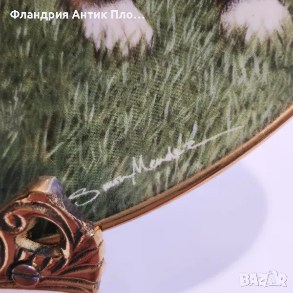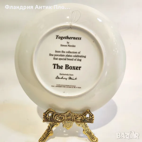 Лимитирана колекционерска чиния от Danbury Mint, част от специалната серия, посветена на породата боксер. Художественото изображение на двойка боксерчета в идилична градинска обстановка носи усещане за топлина и приятелство. Фино изработена с позлатен кант, тази чиния е перфектен подарък за любители на породата и изкуството.