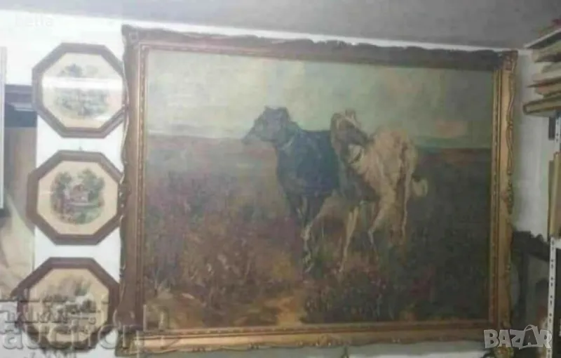Представям ви едно уникално произведение в огромен размер -Хрътки-,картината е донесена от чужбина и е много стара,масло,платно,рамкирана,размера е 1,40/1,10 см,няма подпис,гледана е от доста видни художници по тяхно мнение е майсторска творба,уникално изпълнение,не е давана на експертна оценка,не мога да я снимам добре заема за да хвана точните цветове и размери, почти една стена ,но за повече снимки ми пишете,седи величествено и стилно.Качена е отново с нови снимки на светлина.Цена 3000 лв