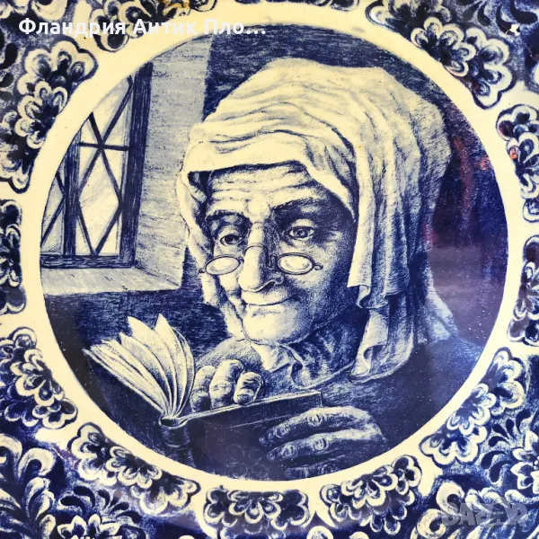Елегантна керамична чиния с класически Delft синьо-бял дизайн, произведена от Bock Frères. Изящен релефен ръб и детайлна ръчна декорация с изображение на възрастна жена с книга. Оригинален печат на гърба, подходяща за декоративна употреба. Колекционерски акцент с история!