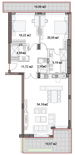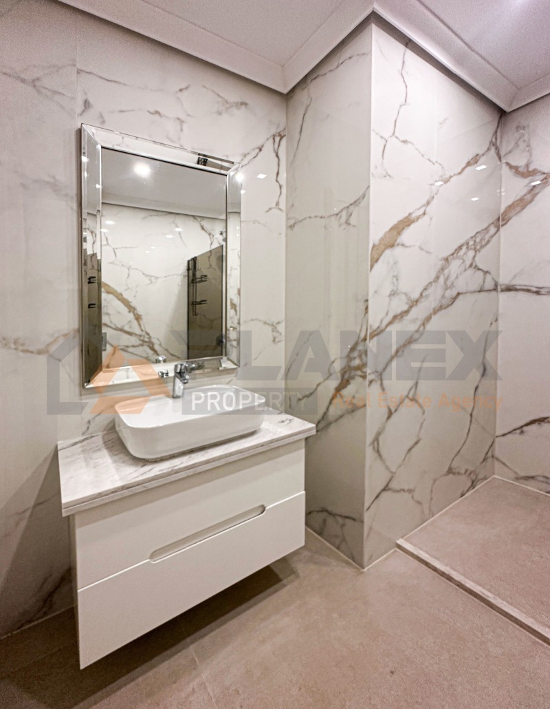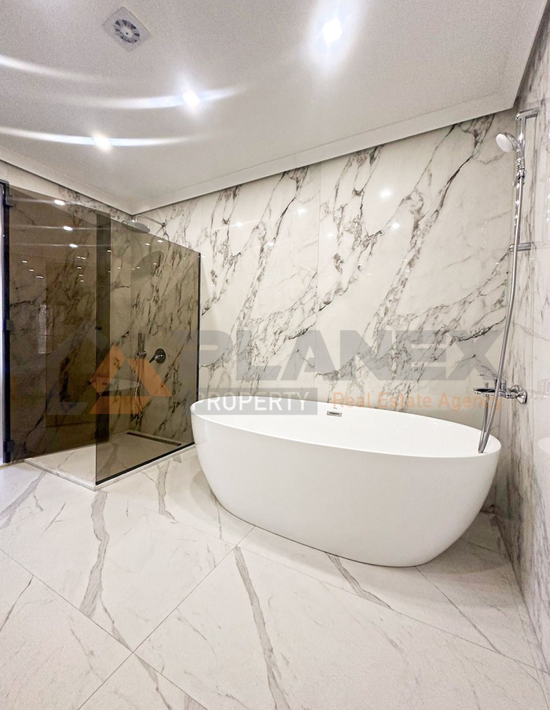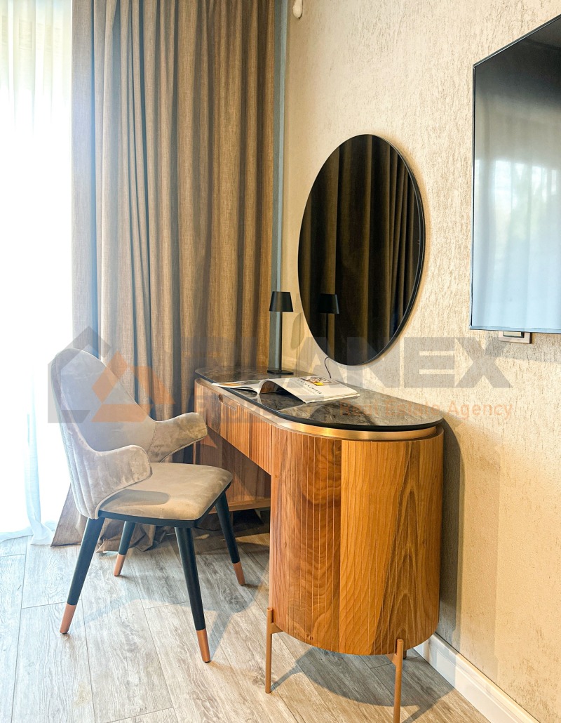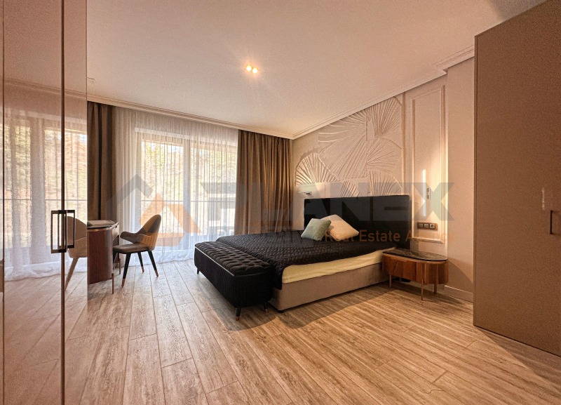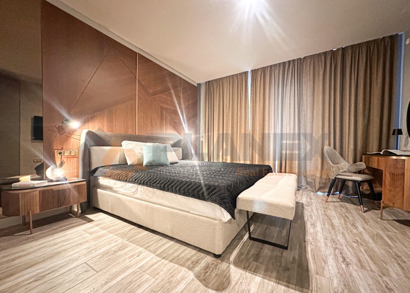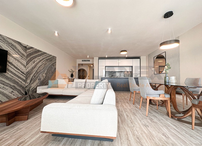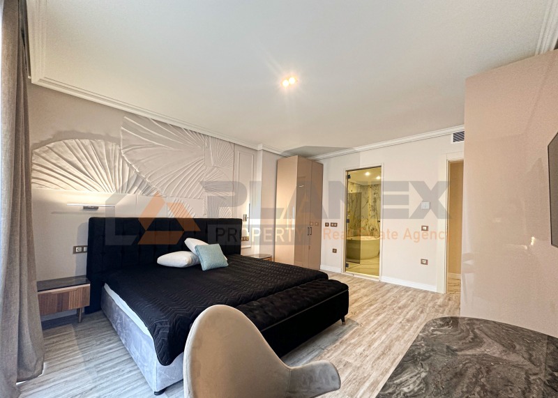 Предлагаме на Вашето внимание чисто нов прекрасен апартамент с две спални намиращ се в луксозен комплекс от затворен тип на първа линия, находящ се в к.к. СВ. св. Константин и Елена. Жилището е луксзно и модерно, проектирано от професионален дизайнерски екип, изпипано до най-малкия детайл, за да даде на своите обитатели максимамален уют и комфорт. Състои се от слънчева и просторна дневна с големина 54.18м2 и излаз към голям балкон и спираща дъха морска панорама, две спални с тераса, с големини съответно 18.22м2 и 20.56м2, едната от които разполага със собствена баня/тоалетна, отделно има още една баня/тоалетна, перално помещение и коридор. Отдава се дългосрочно, като е обзаведено и оборудвано с всичко необходимо за едно домакинство.