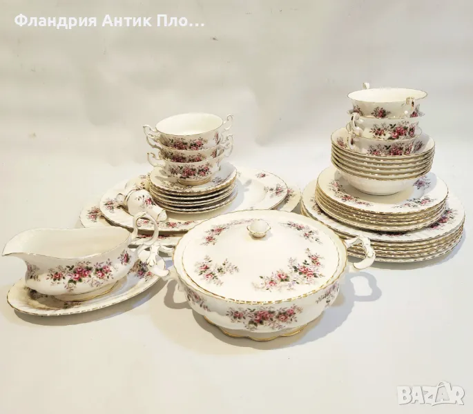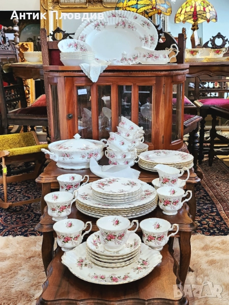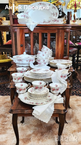Сервизът е в отлично състояние, запазил оригиналния си блясък и неподражаем стил. Един истински шедьовър за ценителите на класическия английски порцелан!