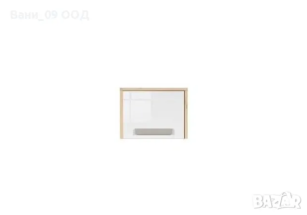 Шкаф за стенен монтаж с размери Ш:60/Д:29.5/В:45.5 см. Притежава красива и елегантна изчистена визия. Корпусът е декорирани в светъл дървесен декор, а вратата в бял гланц с монтирана сив дръжка.