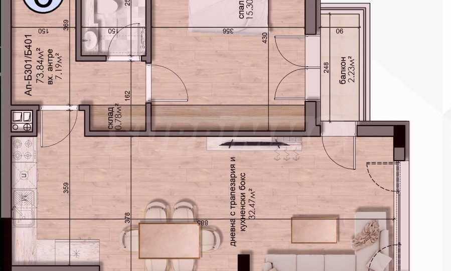 Двустаен апартамент със ЗП 73.56 кв.м.