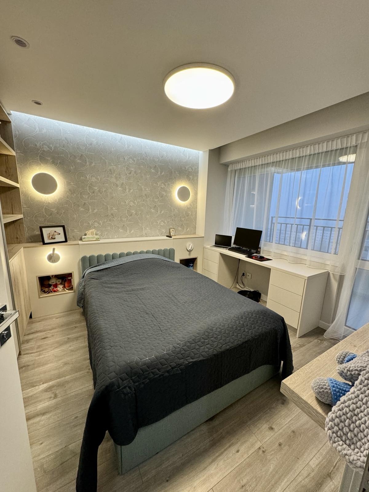 Имотът е ситуиран на 16-ти жилищен етаж и разполага с площ от 91 кв.м., разгърната в следното практично разпределение: коридор, хол с кухненски бокс, две спални, тоалетна, баня с тоалетна, две тераси, таванско помещение.