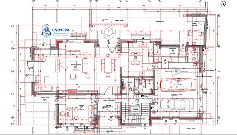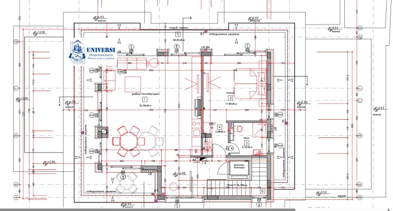 Върху площ от 808м2 са развити четири нива, всяко от които с максимално рационално усвоена площ, без никакви паразитни пространства.
