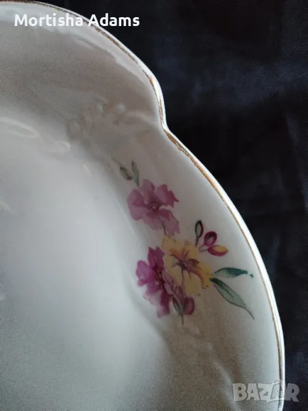 ⚜️ Красиво плато/фруктиера от "Китка", отвор в широката част 30,5см. Здраво, леки драскотини по глазурата и несъвършенства на златния кант.