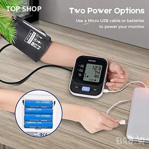 【Операция с едно докосване】Апаратът за кръвно налягане е напълно автоматичен, просто трябва да натиснете един бутон "Старт", за да измерите кръвното си налягане и сърдечната честота, супер лесно и удобно за домашна употреба. Захранва се с 4 AAA батерии (не са включени) или е свързан към USB (не са включени). Цифровият тестер за кръвно налягане ще се изключи автоматично, ако не се използва за 60 секунди, за да пести енергия.