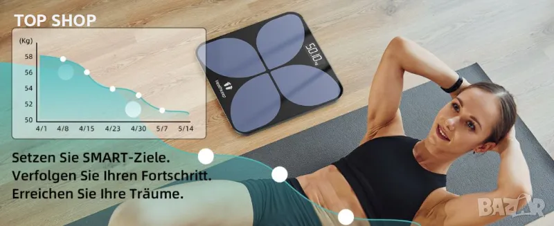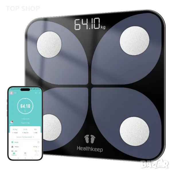 Лична везна, Победител в дигитален тест с App Smart Scale, Bluetooth везна за телесен анализ с телесни мазнини, ИТМ, мускулна маса, протеин, BMR, 25 x 26 cm