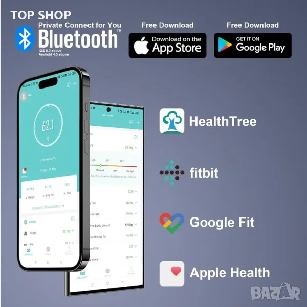 Безпроблемно освобождаване на напредъка: Останете мотивирани, като споделяте напредъка си в социалните медийни платформи. Синхронизирайте приложението на везната с любимото си приложение за везни и го интегрирайте безпроблемно с Apple Health, Google Fit и FitBit. Тази интеграция централизира вашите данни, за да можете лесно да проследявате и отбелязвате постиженията си.